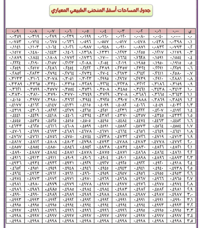 جدول المساحات أسفل المنحنى الطبيعي المعياري يُعد جدول المساحات أسفل المنحنى الطبيعي المعياري (Standard Normal Distribution Table أو Z-Table) من أهم الأدوات في الإحصاء والاحتمالات،…